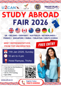 🌏 STUDY ABROAD FAIR 2026 ✈️🎓Dream. Plan. Fly Abroad. 📍 Hotel Ramyas, Trichy📅 11 Jan 2026 | ⏰ 10 AM – 4 PM🎟️ FREE ENTRY Meet top universities from:UK | Ireland | Germany | Australia | Canada | France | Singapore | Dubai | Malaysia | South Korea ✔️ University reps✔️ Visa & loan guidance✔️ IELTS / PTE support✔️ Spot …